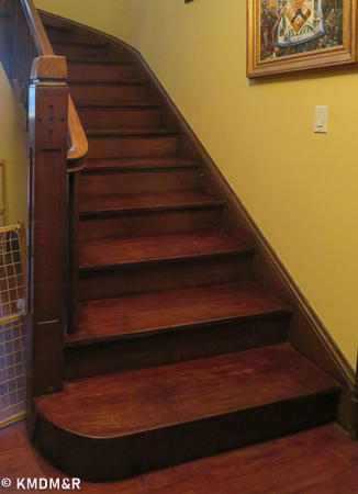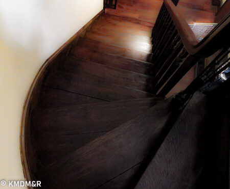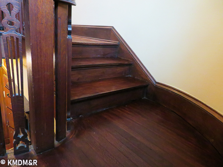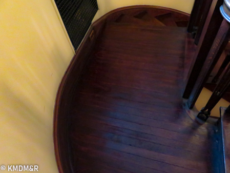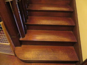 Mahogany Wood, The restoring process required that every stroke be done with a steady hand for uniform coverage including edges and corners. the stain removal and the application of the new stain that would glide thoroughly without any dark spots.Color consistency with railings by custom mixing. The effect is accomplished after several coats and appropriate sealer for protection in a high transit area such as a staircase.